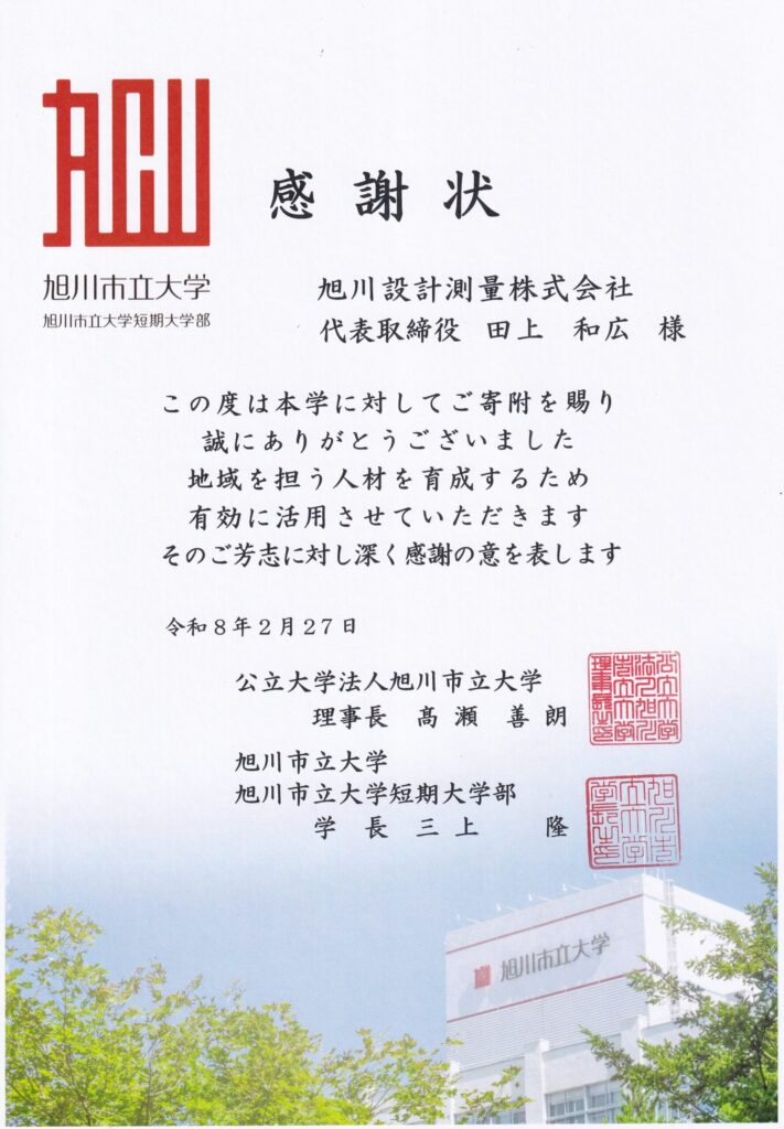 当社は旭川市立大学への寄付を行い、このたび大学より感謝状をいただきました。